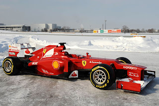 Acara launching mobil lalu berlanjut ke luar. Di tengah salju yang menutupi sirkuit Fiorano (sirkuit tempat tes Ferrari), Fernando Alonso dan Felipe Massa menjalani sesi photoshoot sebagai bagian dari launching mobil ini. Belum pernah kan, lihat mobil F1 di atas permukaan salju ? Inilah foto2nya...